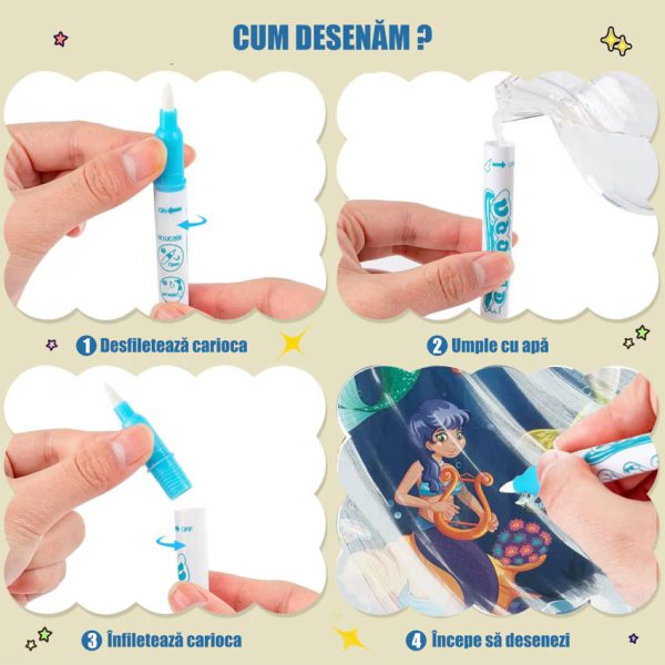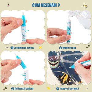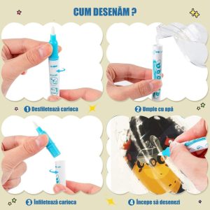 [Usor de utilizat] – Copilul dumneavoastra il poate folosi cu usurinta, doar adaugati apa pe stiloul nostru special. Apoi, copiii pot desena singuri. Dupa 5-10 minute pentru uscare, copiii il pot picta din nou. De asemenea are dimensiunea perfecta pentru a se strecura in bagajul de mana al copilului dumneavoastra si pentru a-l insoti in fiecare calatorie.