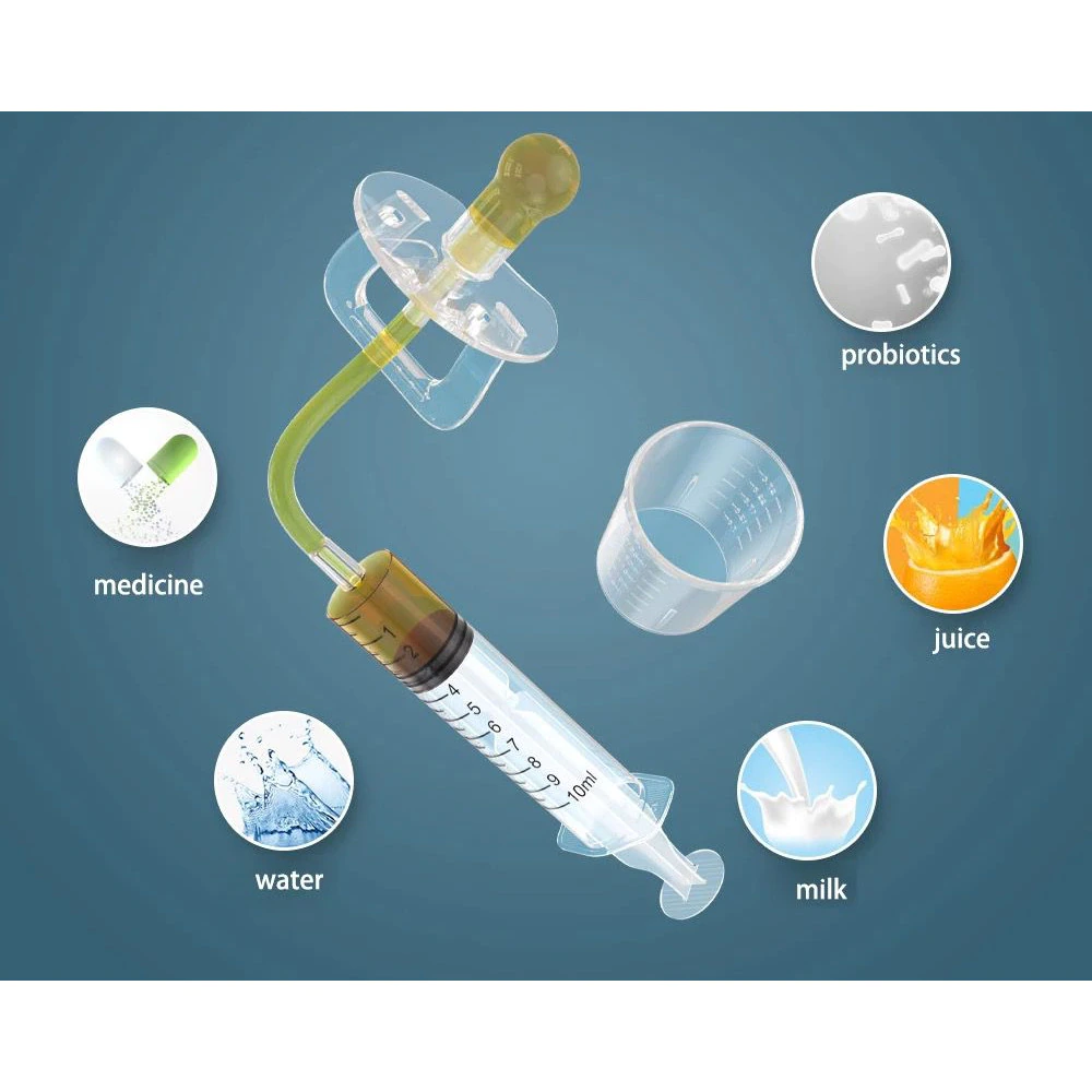 Dispozitiv gradat tip suzeta cu recipient in forma de seringa special conceput pentru a administra bebelusilor, inca de la nastere, in cel mai simplu si eficient mod medicamentele sau alimentele fluide (de tip sirop si nu numai).