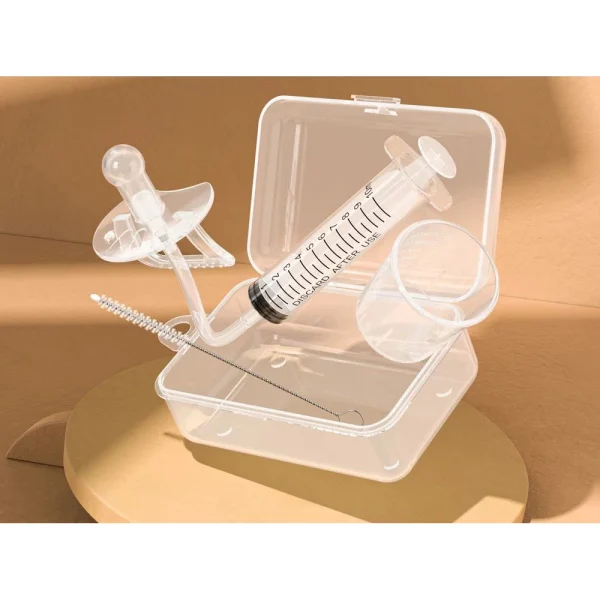 In cazul dispozitivului nostru terminatia tip suzeta a seringi ii „convinge” cu usurinta pe cei mici sa accepte administrarea medicamentelor, iar jetul de fluid ajunge pe partile laterale ale gurii si nu direct in gatul bebelusului astfel prevenind-se efectul de gag.
