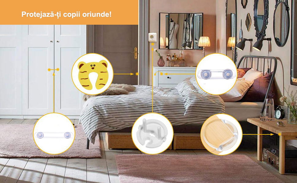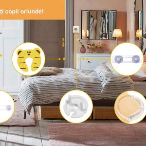 Setul nostru de protectie pentru copii va va ajuta sa rezolvati totul. Incuietorile de siguranta pentru dulap pot fi instalate aproape oriunde: in baie, bucatarie, sub chiuveta, pe sertare, usile dulapurilor de spalatorie, etc. Poate proteja copilul si animalele de companie de a se rani in timp ce va exploreaza casa.