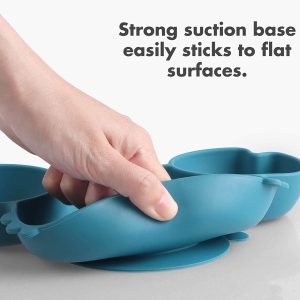 Formele curbate ale platoului de silicon ghideaza miscarile celor mici pentru a-i ajuta sa umple tacamurile.
